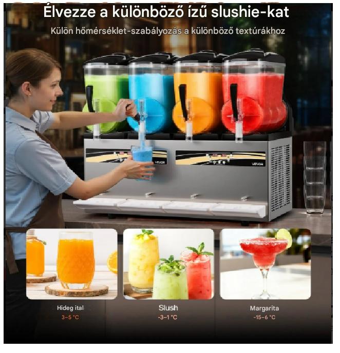 Különféle italokhoz: Ez a továbbfejlesztett kereskedelmi forgalomban kapható jegeskávéfőző 5 és 50℉ / -15 és 10℃ között állítható hőmérséklet-tartománnyal rendelkezik, így szabályozhatja italai lágyságát vagy keménységét. Hideg italokhoz: 3 és 5℃ / 37,4 és 41℉ között; alkoholmentes jegeskávékhoz: -3 és -1℃ / 26,6 és 30,2℉ között; alkoholos italokhoz: -15C és -6C / 5F és 21,2℉ között. (Ajánlott cukortartalom: körülbelül 13%, alkoholtartalom: 13% alatt). Ideális különféle italok, például gyümölcslevek, tea, margarita és jegeskávé készítéséhez.